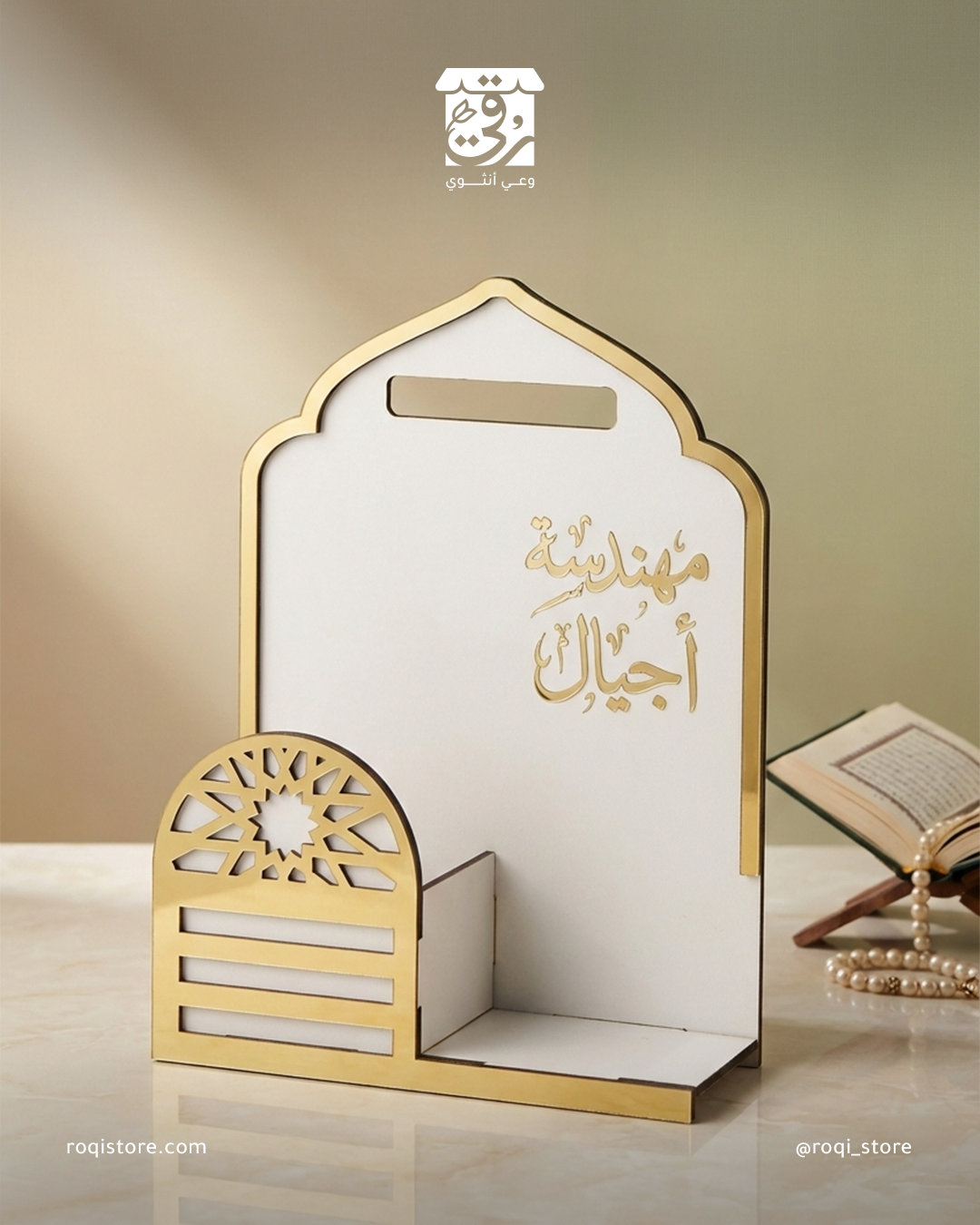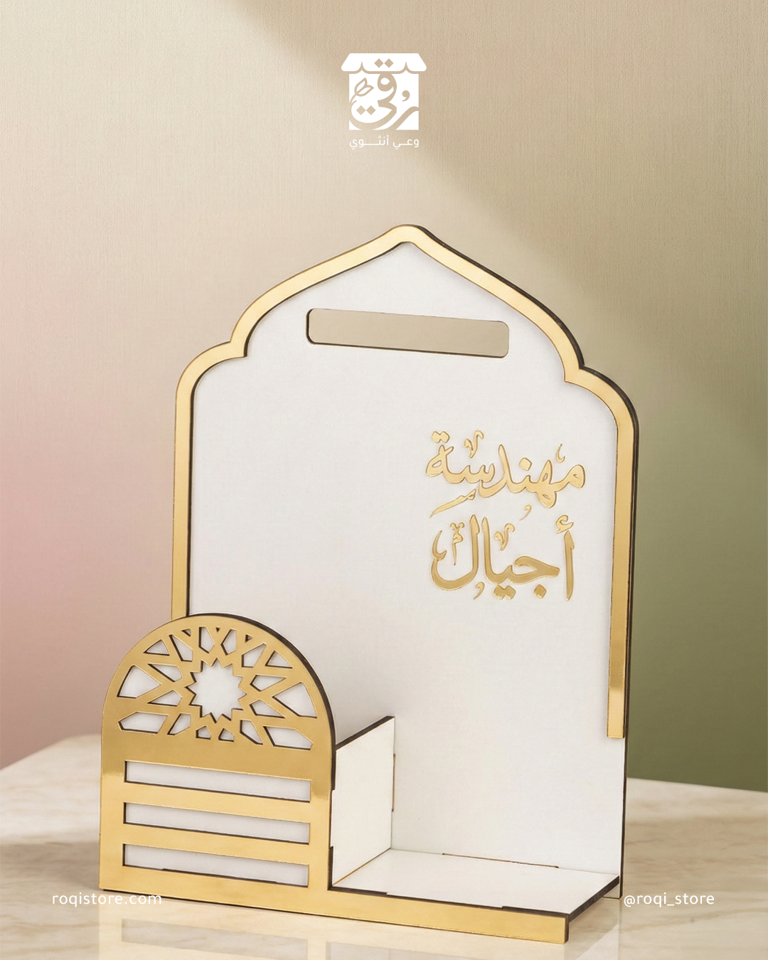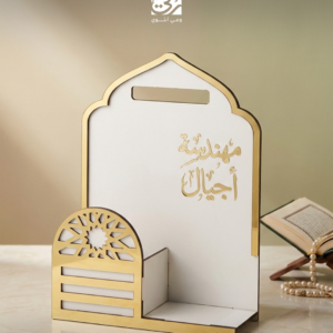 منظم المكاتب “أناقة الإنجاز” 🗂️ “لمسةُ ترتيبٍ تليقُ بمهامكِ الكبيرة. يجمع أوراقكِ وأدواتكِ بأسلوبٍ هندسي يحمل هويتكِ بكل فخر 🌿. يزين مكتبكِ ليذكركِ بأن كل خطة ترتبينها هنا هي لبنةٌ في صرح الأمة 🤍. تصميم أبيض وذهبي يبعث على الإلهام.”