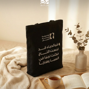 “رفيقةُ دربكِ التي تنطق بجمال روحكِ. ترافقكِ في خطواتكِ بعبارة ‘فبالحياء قد لبست التاجَ.. فكنت نجماً في السما وهاجاً’، لتكون رسالتكِ الصامتة في كل مكان 🌟: تُذكّركِ بأن زينتكِ الحقيقية هي حياؤكِ، وأنكِ به تشرقين كالنجمة العالية 🤍. مساحة عملية وأناقة باللون الأسود الملكي.. تليق بامرأةٍ تتوجت بالرقي 🌿.”